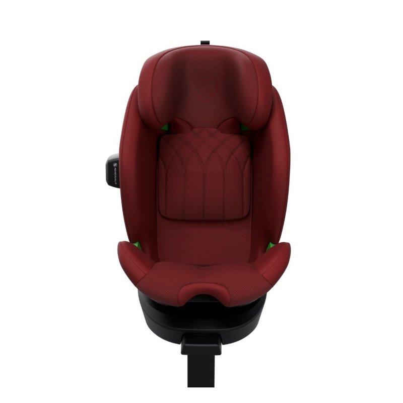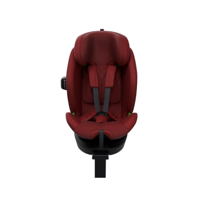 Dispõe de sistema de rotação para facilitar a colocação e retirada da criança, apoio de cabeça com espuma de memória para maior conforto e melhor absorção de impactos, têxteis respiráveis com ventilação integrada e encosto reclinável com várias posições.
