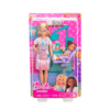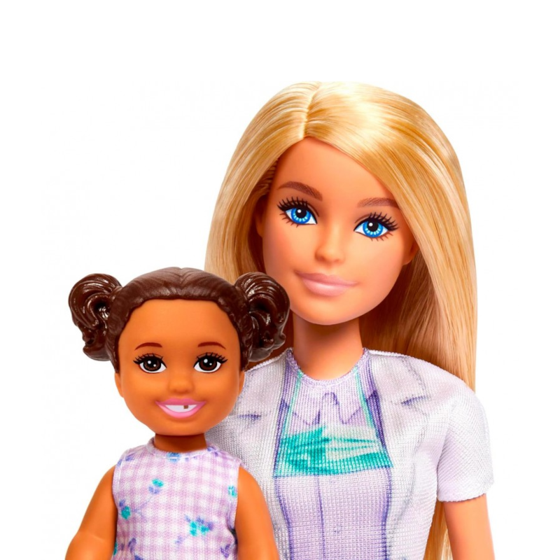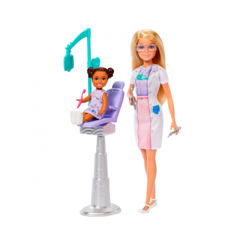 O set inclui duas bonecas – a Barbie Dentista e a sua simpática paciente – além de um consultório completo, com cadeira de paciente, prateleiras e vários acessórios realistas, como utensílios odontológicos, escova e pasta de dentes. As peças encaixam-se perfeitamente nas mãos da Barbie para tornar a brincadeira ainda mais autêntica.