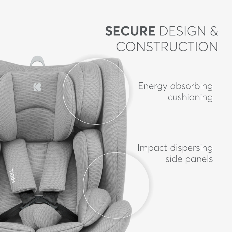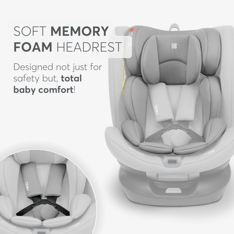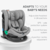 Apoio de cabeça ajustável em 24 posições, com almofada em espuma de memória para maior suporte. O sistema de arnês de 5 pontos é acolchoado e acompanha o crescimento da criança, mantendo-a sempre segura e confortável.