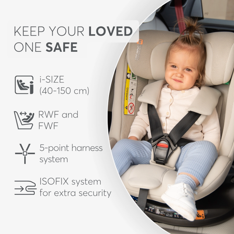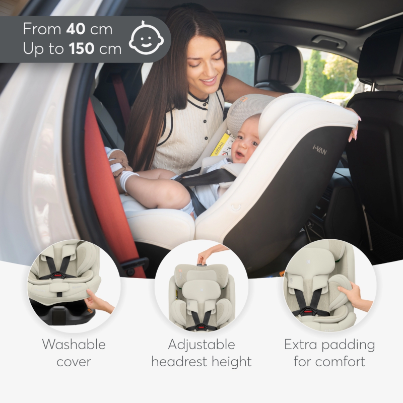 A cadeira auto Kikkaboo I-van i-Size é uma solução evolutiva, segura e confortável pensada para acompanhar o crescimento da criança desde os primeiros meses até cerca de 12 anos (40–150 cm).