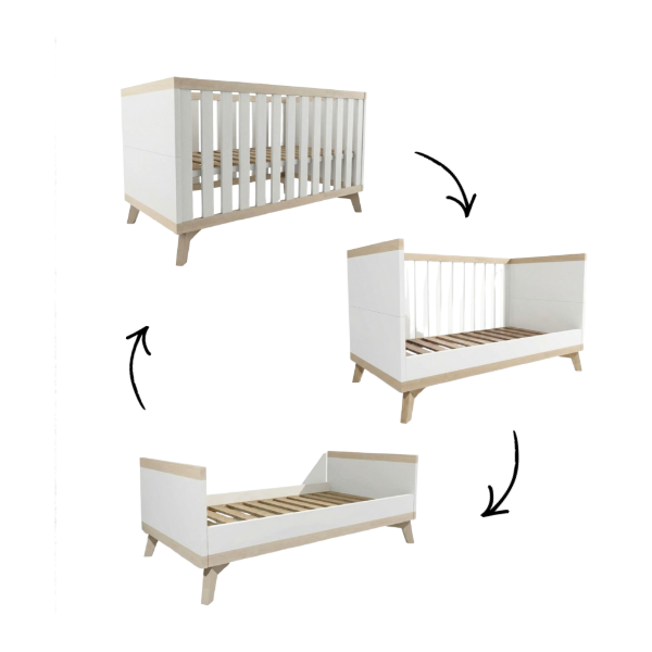 Inclui kit de conversão, permitindo transformar o berço numa pequena cama, prolongando a sua utilização ao longo dos primeiros anos da criança.