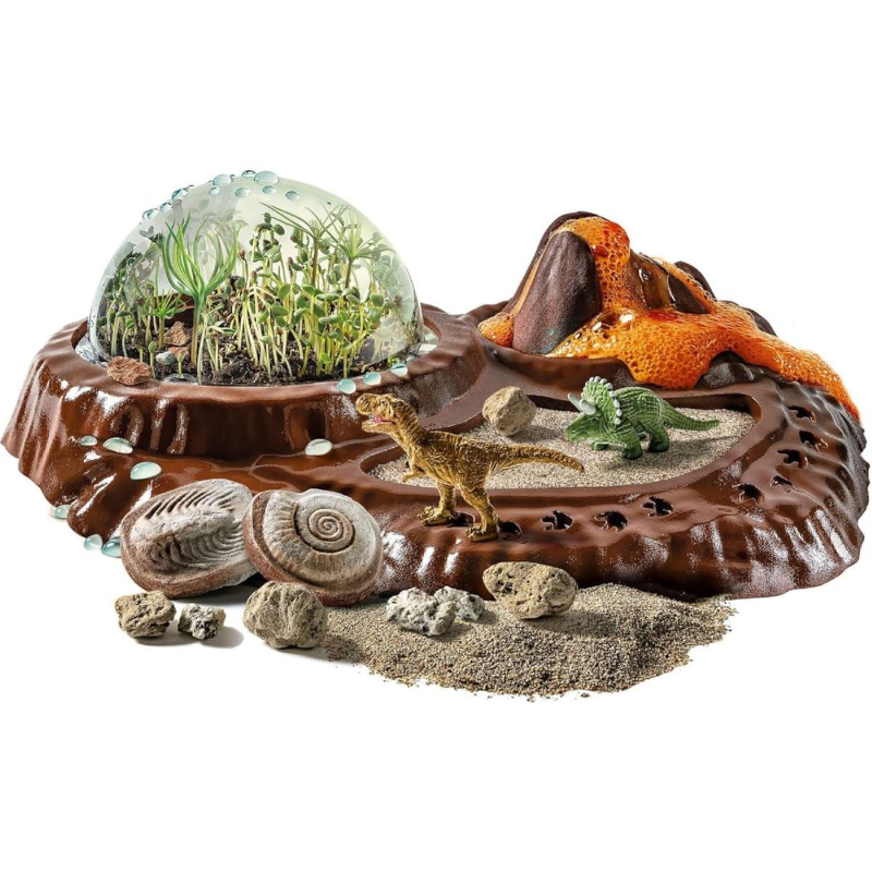 Inclui 2 modelos de dinossauros, um T-rex e um Tricerátops, que completarão a experiência criando um ecossistema completo.