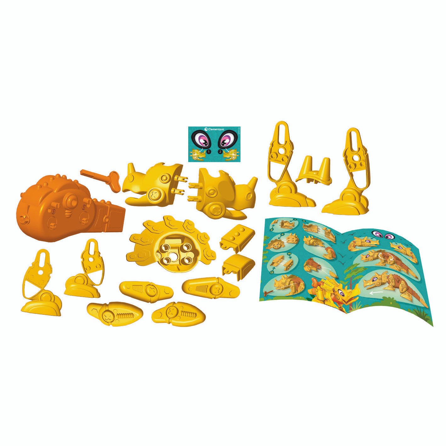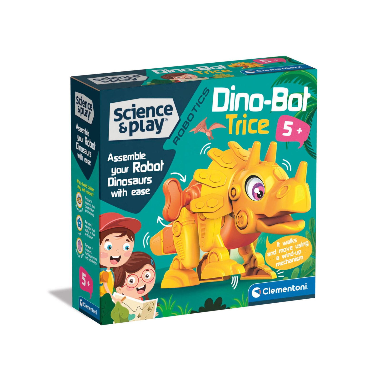 O Dino-Bot Triceratops da Clementoni são concebidos para desenvolver destreza manual e o pensamento lógico, aproximando as crianças em idade pré-escolar das matérias STEM. Este modelo reproduz um dos dinossauros mais populares, o Triceratops, de uma forma colorida e divertida. Cada Dino é fácil de montar graças às ferramentas fornecidas no kit. O brinquedo tem mecanismos especiais que permitem a cada modelo realizar movimentos únicos.