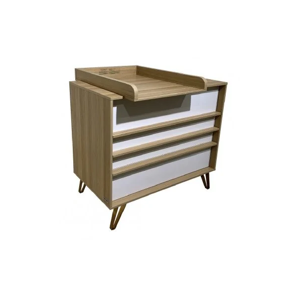 Acompanha um prático trocador de madeira, integrado para maior comodidade. Destacam-se suas 4 lindas pernas de design em ferro com acabamento cobre, proporcionando um toque de sofisticação e distinção. “Trieste” é mais que uma cómoda, é uma peça chave que alia beleza e funcionalidade no cuidado diário do seu bebé.