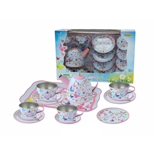 Inclui 14 peças: 1 bule com tampa e asa, 4 chávenas, 4 pratos grandes, 4 pequeninos para servir o chá e uma bandeja.