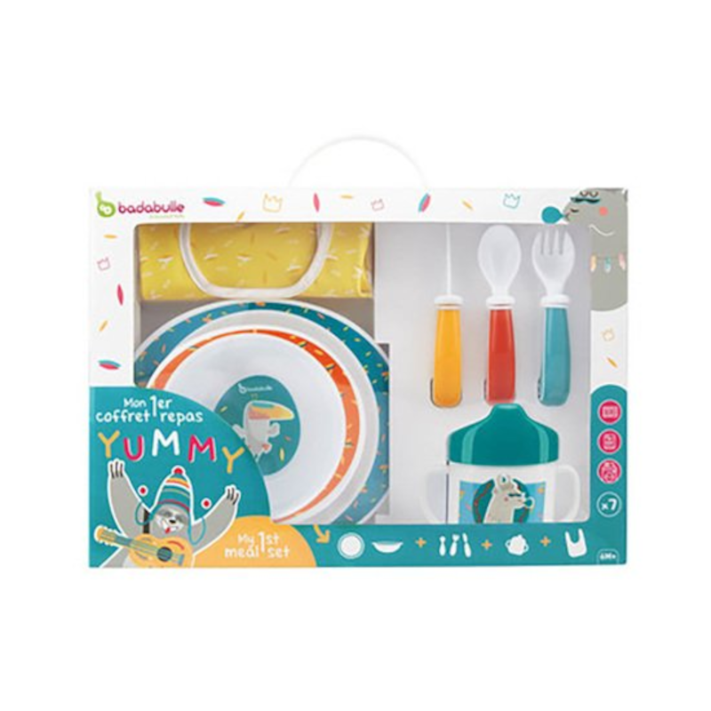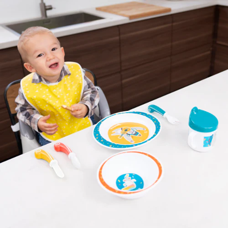 Este kit completo inclui 7 acessórios: prato, taça, copo c/ bico, talheres e babete.