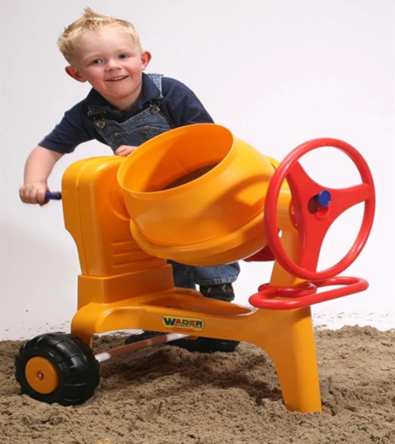 1 betoneira funcional, onde as crianças podem colocar areia e girar como se estivessem a preparar cimento