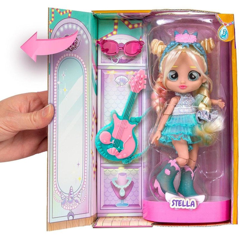 Stella está vestida como uma verdadeira estrela da música, pronta para te impressionar com a sua aparência elegante e moderna. Diverte-te com as tuas personagens de moda favoritas da BFF – Stella vestida como uma guitarrista. Com uma boneca totalmente articulada, podes posicioná-la de muitas maneiras para encenar o concerto dos teus sonhos. O seu longo cabelo de nylon é ótimo para ser penteado, criando estilos na moda, e com os olhos de vidro, ela brilhará como uma verdadeira estrela.