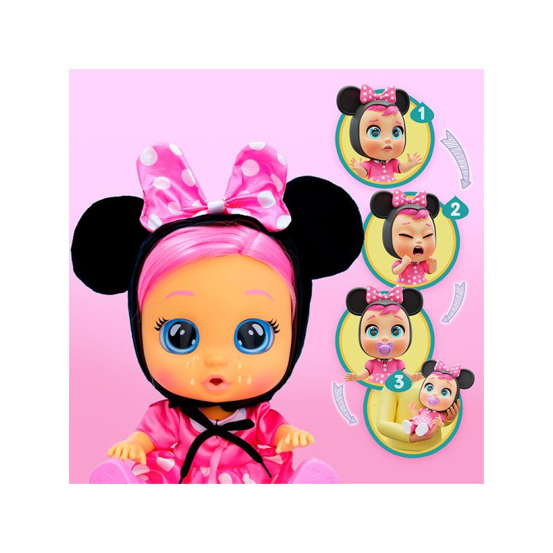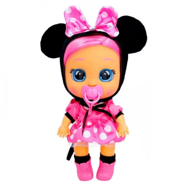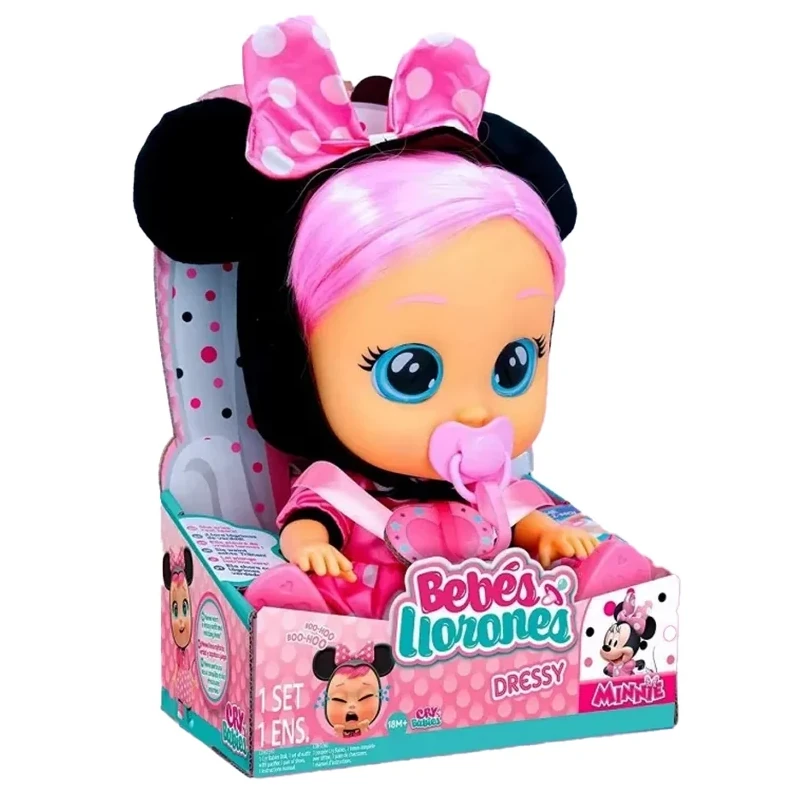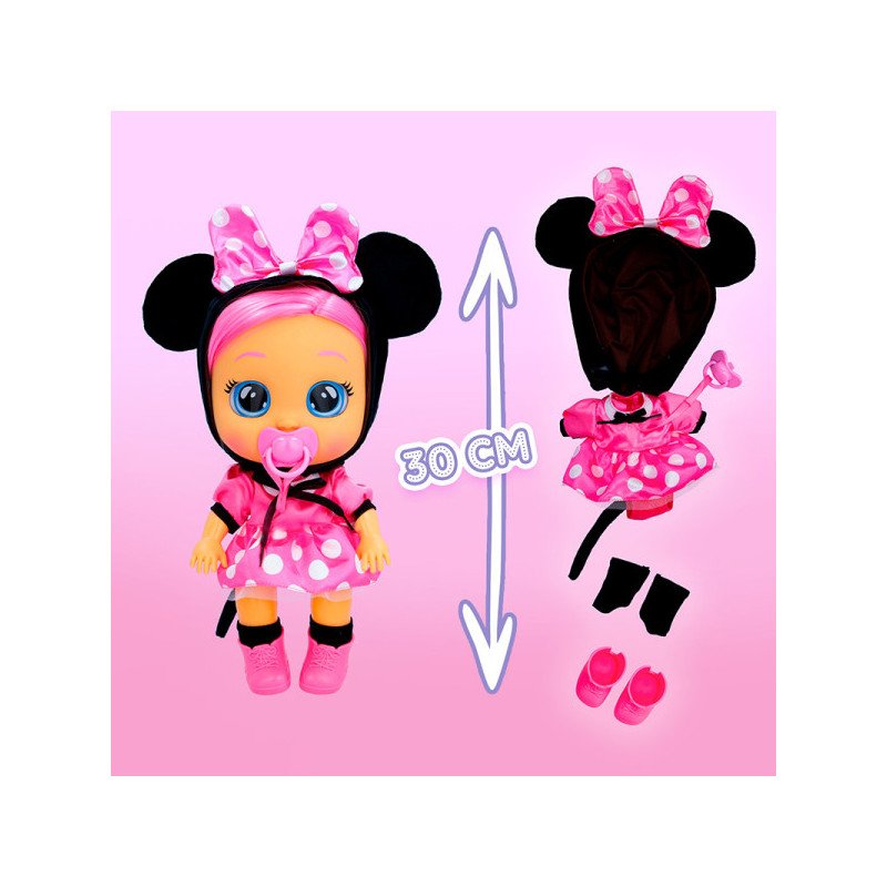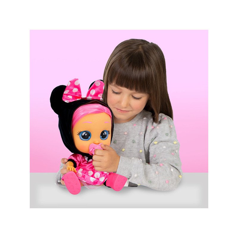 Descubra a nova Cry Baby Minnie, do mundo da Disney! Como todos os novos Cry Babies, Minnie tem pelo de verdade, olhos de vidro e um rosto mais suave. Além disso, ela está usando seu vestido de bolinhas da Disney. Ela também chora lágrimas de verdade e toca sons de bebê sem a chupeta. Coloque-o e ele vai parar de chorar.