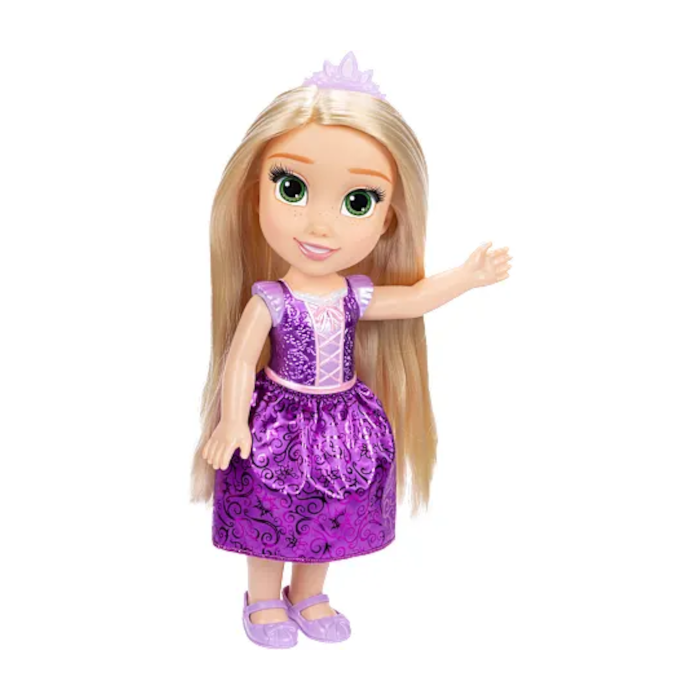 Com o seu vestido roxo brilhante e o longo cabelo loiro para pentear e criar penteados, a Rapunzel está pronta para viver novas aventuras seja na torre, no castelo ou em qualquer mundo imaginário que a criança quiser criar.