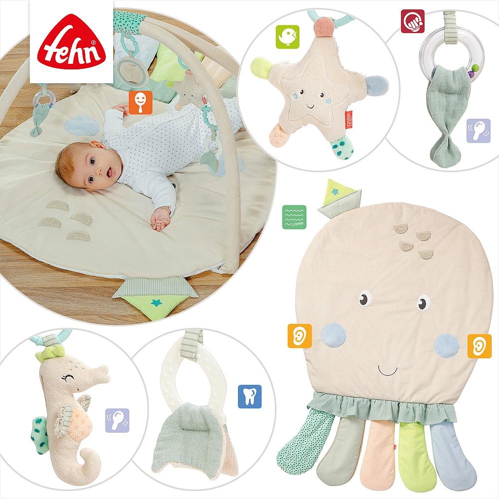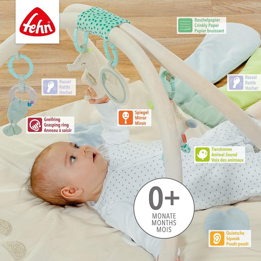 Ajudam no desenvolvimento sensorial e motor graças as pequenas criaturas marinhas no arco de jogo promovem a preensão direcionada e a coordenação olho-mão.