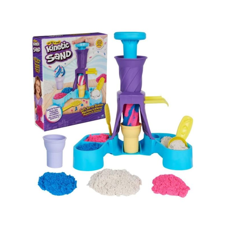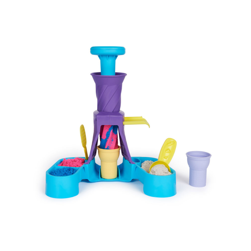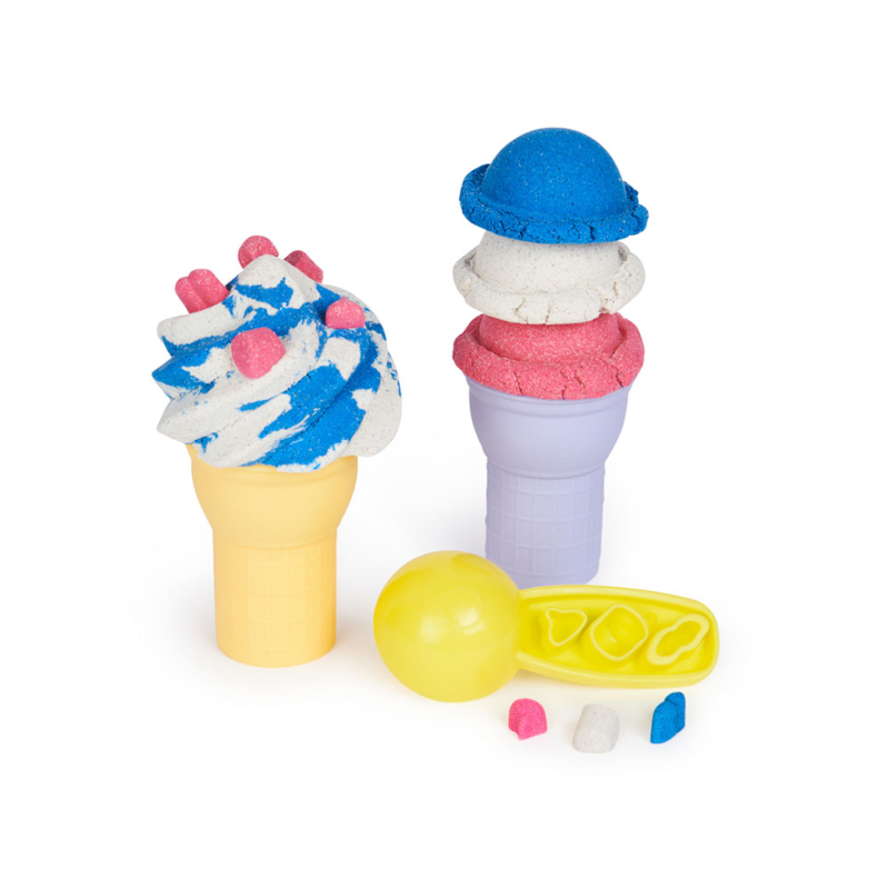 Máquina incrível para criar e personalizar gelados com 396 gramas de areia (3 cores: rosa, azul e branco), 2 ferramentas e 2 acessórios incluídos. Com uma área lúdica para imitar experiências reais de criação de gelados.