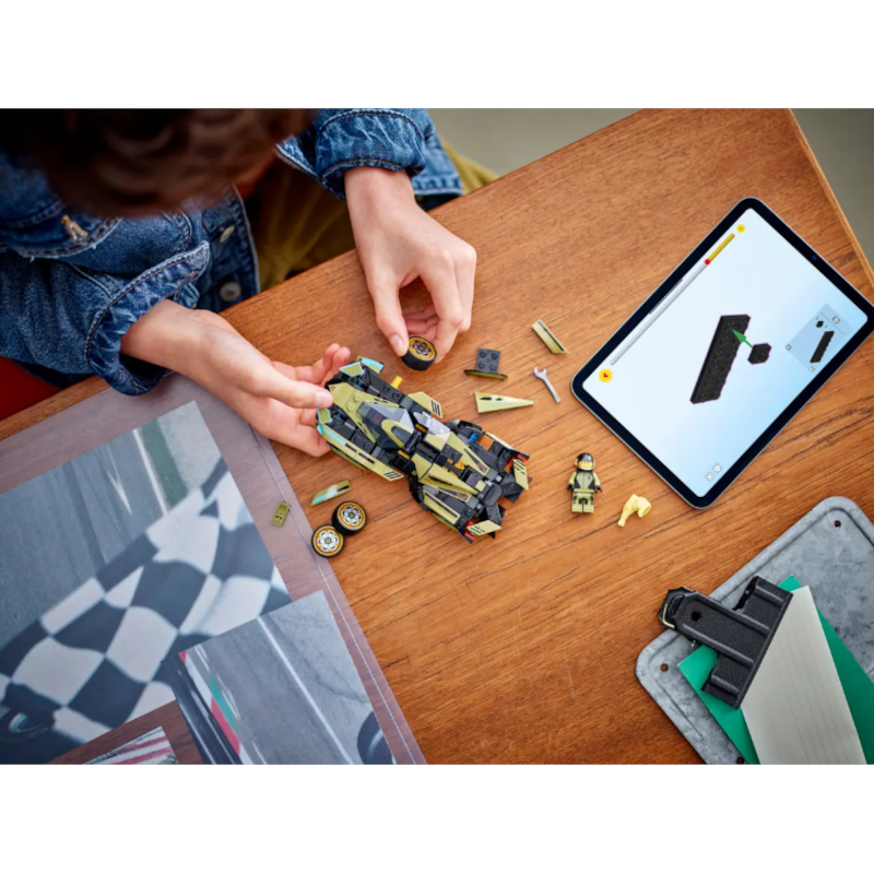 O conjunto inclui uma minifigura de piloto com macacão de competição Gran Turismo e capacete, pronta para ser colocada no habitáculo e dar início às corridas mais emocionantes.