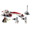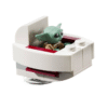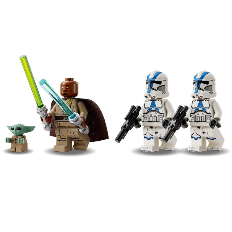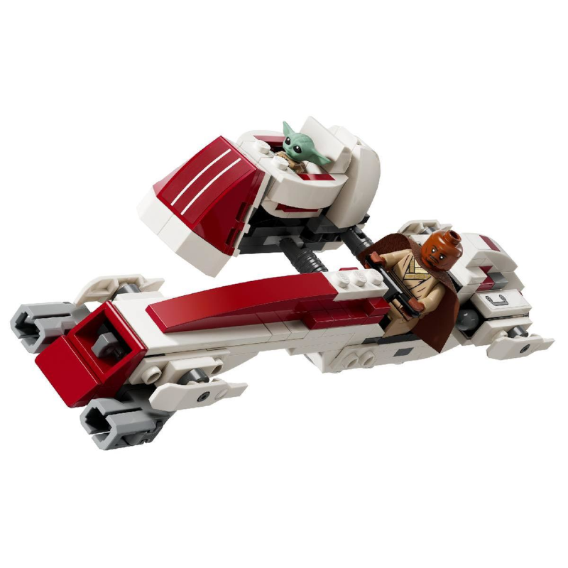 A detalhada moto speeder BARC de Star Wars possui cabine para uma minifigura, 2 canhões que disparam e sidecar destacável com espaço para o carrinho flutuante do Grogu.