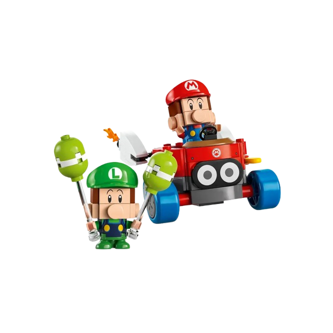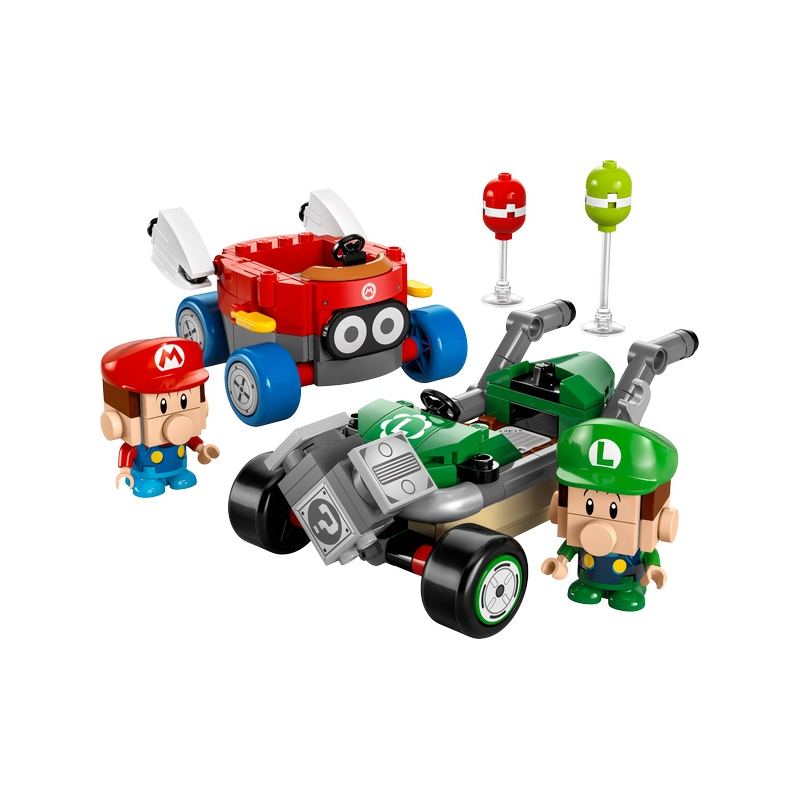 O kit inclui duas figuras colecionáveis adoráveis – Bebé Mario e Bebé Luigi – e os seus veículos construíveis, o Marchimotas GTI e o Tribólido. Prontos para competir, estes karts permitem organizar corridas empolgantes, batalhas de estouro de balões e muitas outras aventuras cheias de ação.