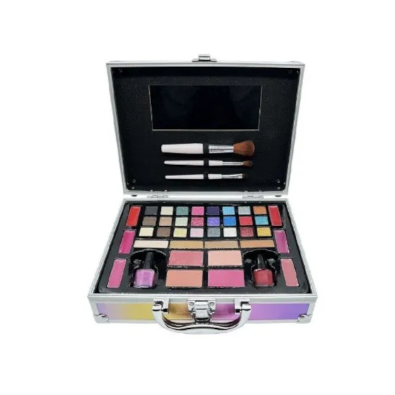 Um estojo de maquiagem super lindo com uma grande variedade de tons de sombra para você começar no mundo da maquiagem. Esta pasta é fácil de levar para onde você quiser, até mesmo em uma viagem. É uma caixa de metal reutilizável, e possui acabamento metálico brilhante na cor rosa. Alta qualidade profissional, ótimo poder de pigmentação e durabilidade.