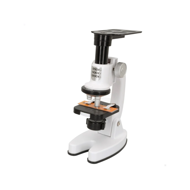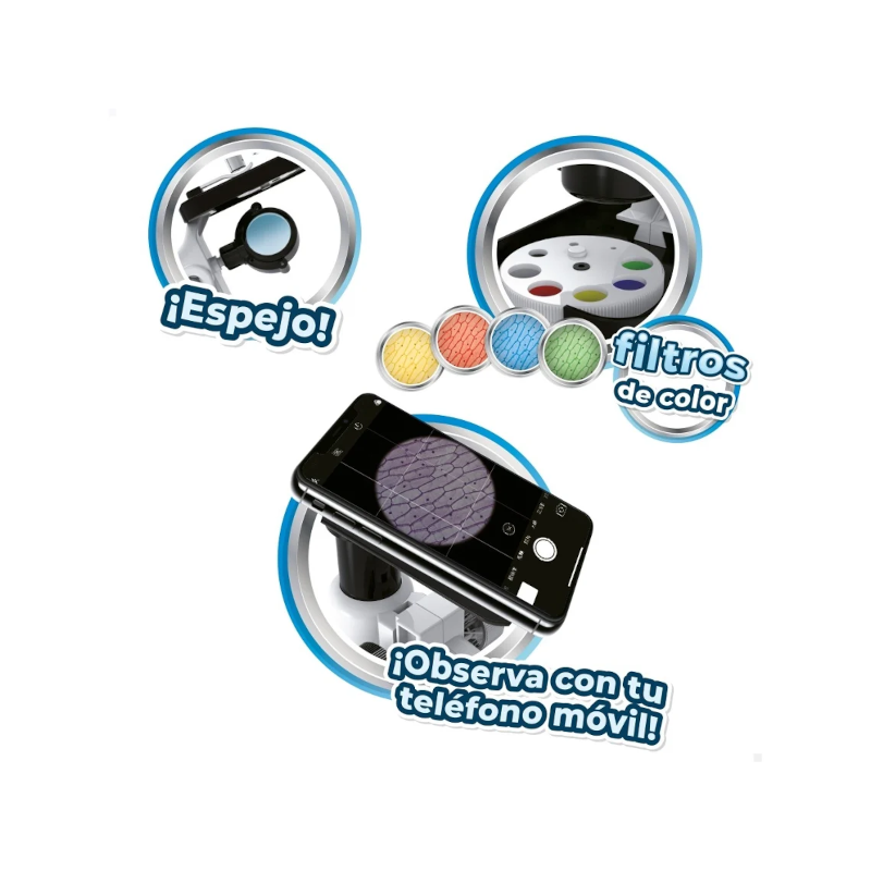 Este incrível microscópio possui uma luz LED e um suporte para telemóvel. Você poderá observar as amostras com a câmera do seu telemóvel e tirar fotos delas.