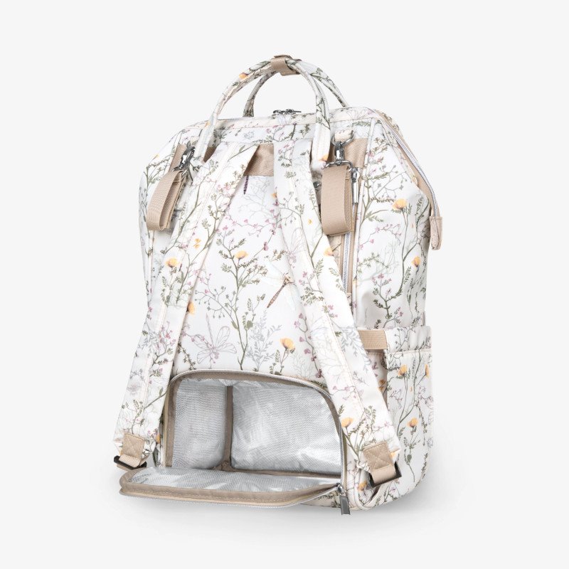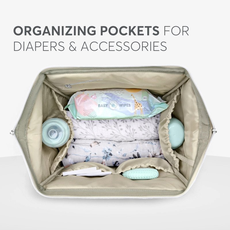 • Armazenamento inteligente – bolso principal largo com estrutura metálica para fácil acesso, compartimentos organizadores para fraldas e acessórios, e bolso resistente à água para itens molhados