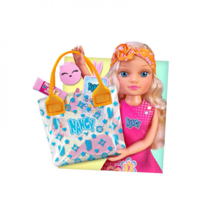 Inclui também uma bolsa transparente com diversos acessórios: telemóvel com capa cor de rosa, batom, óculos, pó compacto, lanche, caixa de chicletes e milkshake de morango.