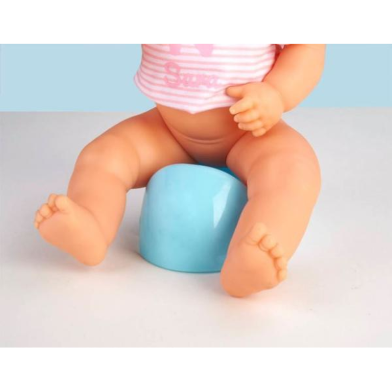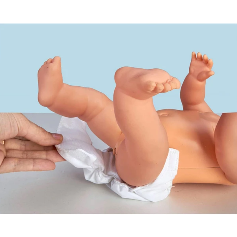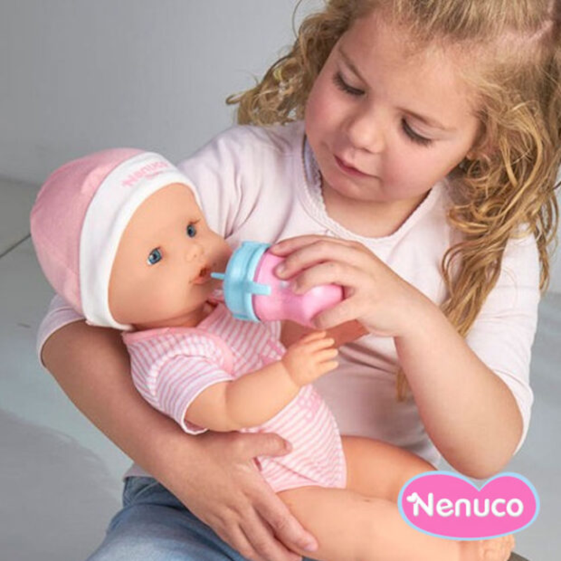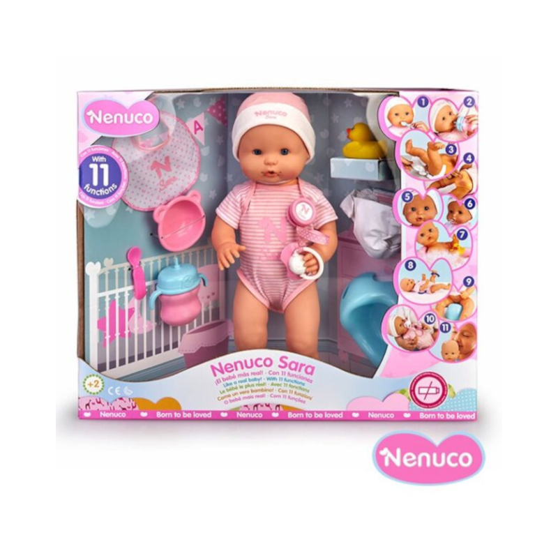 Além disso, vem com 10 acessórios para um cuidado mais completo e tem vestido um pijama cor de rosa muito suave com o seu nome. Pode-se vestir e despir e também pode brincar na banheira.