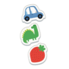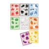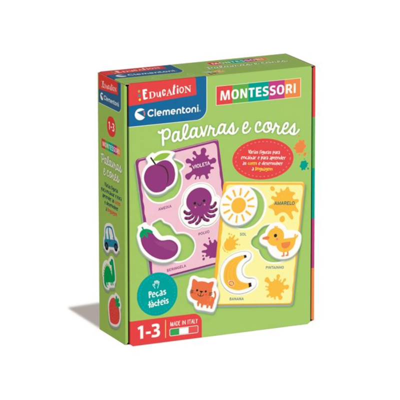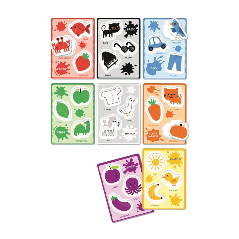 Com cartões de grande formato e peças com formas e imagens em relevo, as crianças associam cada figura à cor correta, ao mesmo tempo que desenvolvem o vocabulário, o sentido táctil e as primeiras competências cognitivas.