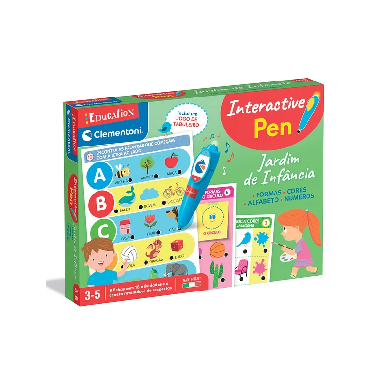 O Interactive Pen – Jardim de Infância da Clementoni é um jogo educativo interativo especialmente concebido para os primeiros anos do pré-escolar. Através de um tabuleiro colorido e uma caneta eletrónica, as crianças exploram conceitos básicos como formas, cores, números e letras, de forma autónoma e divertida.