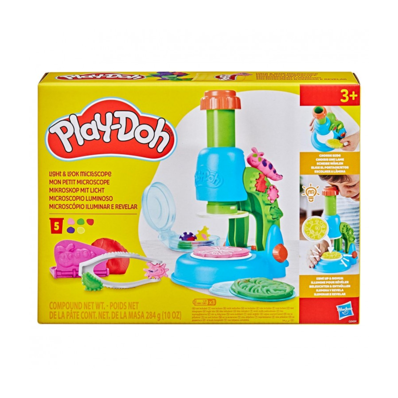 Com um microscópio que realmente se ilumina, as crianças podem criar, observar e surpreender-se com o resultado! Basta escolher uma das lâminas transparentes, preenchê-la com massinhas Play-Doh coloridas e colocá-la sob o microscópio para ver as criações ganharem vida com efeitos luminosos incríveis.