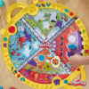 O tapete inclui 4 áreas de brincadeira temáticas, divididas em quadrantes cheios de cor e imaginação: