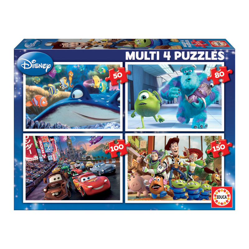 Cada caixa contém 4 puzzles com diferente número de peças (entre 50 e 150), para que as crianças se atrevam com vários níveis de dificuldade a medida que crescem e ganham prática na montagem.