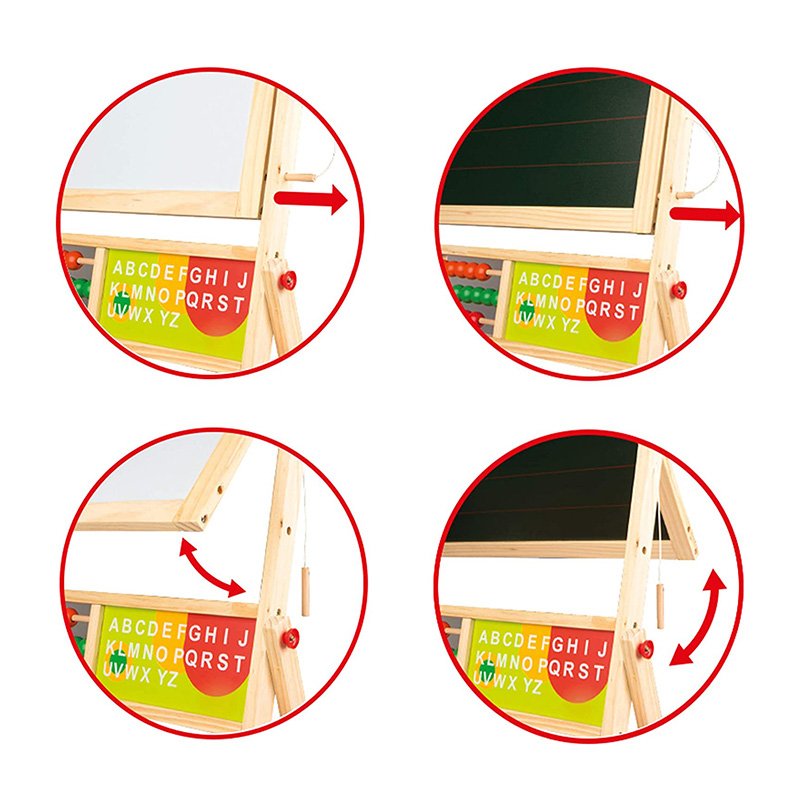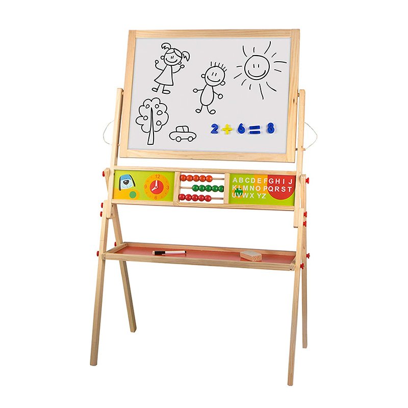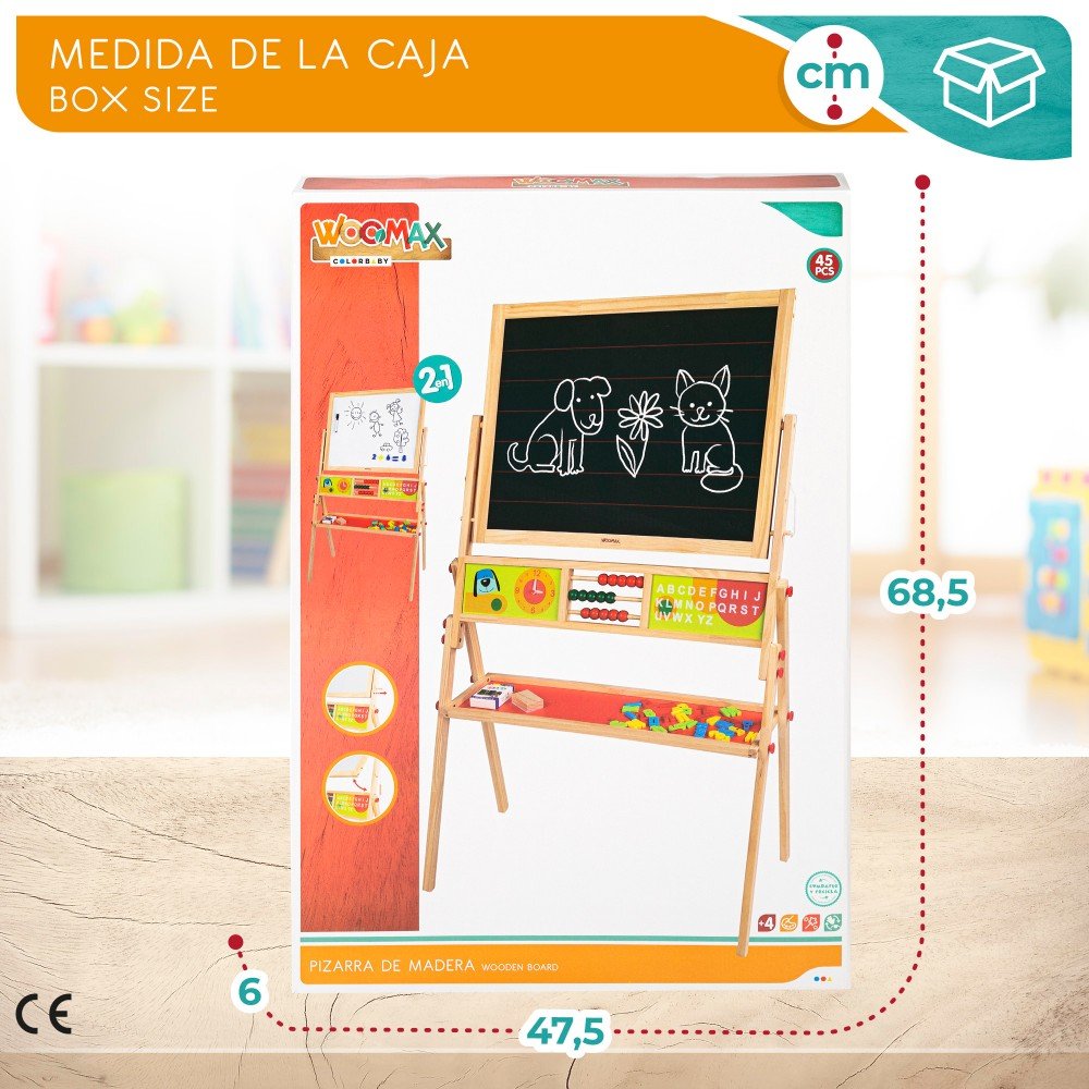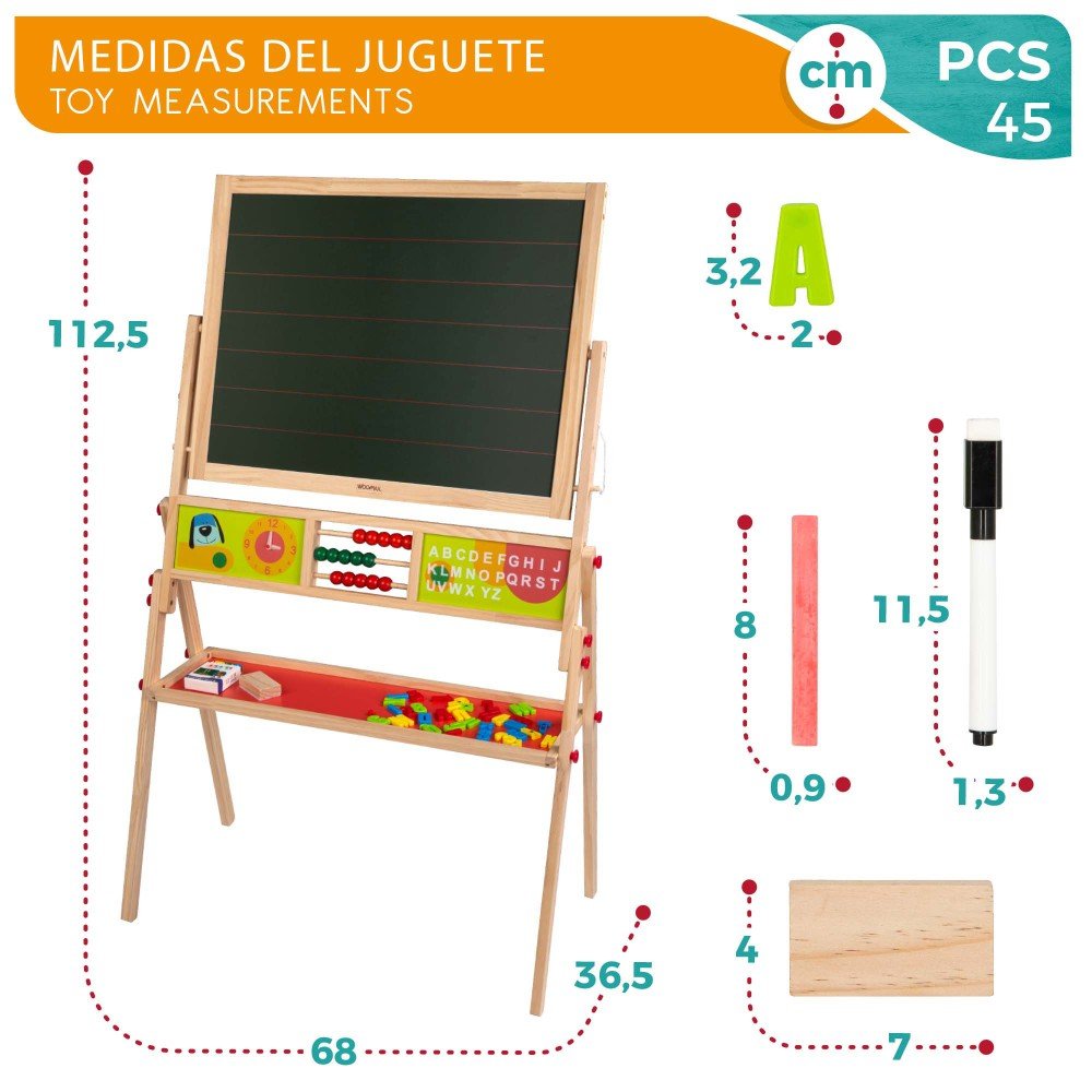 Este incrível quadro que estimula a aprendizagem e a melhoria da escrita tens duas faces: uma face com um quadro negro de giz e outra face branca para escrever com marcadores.