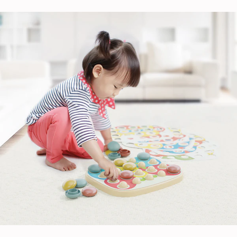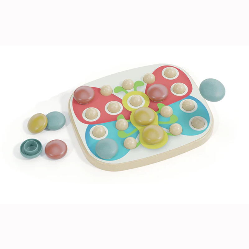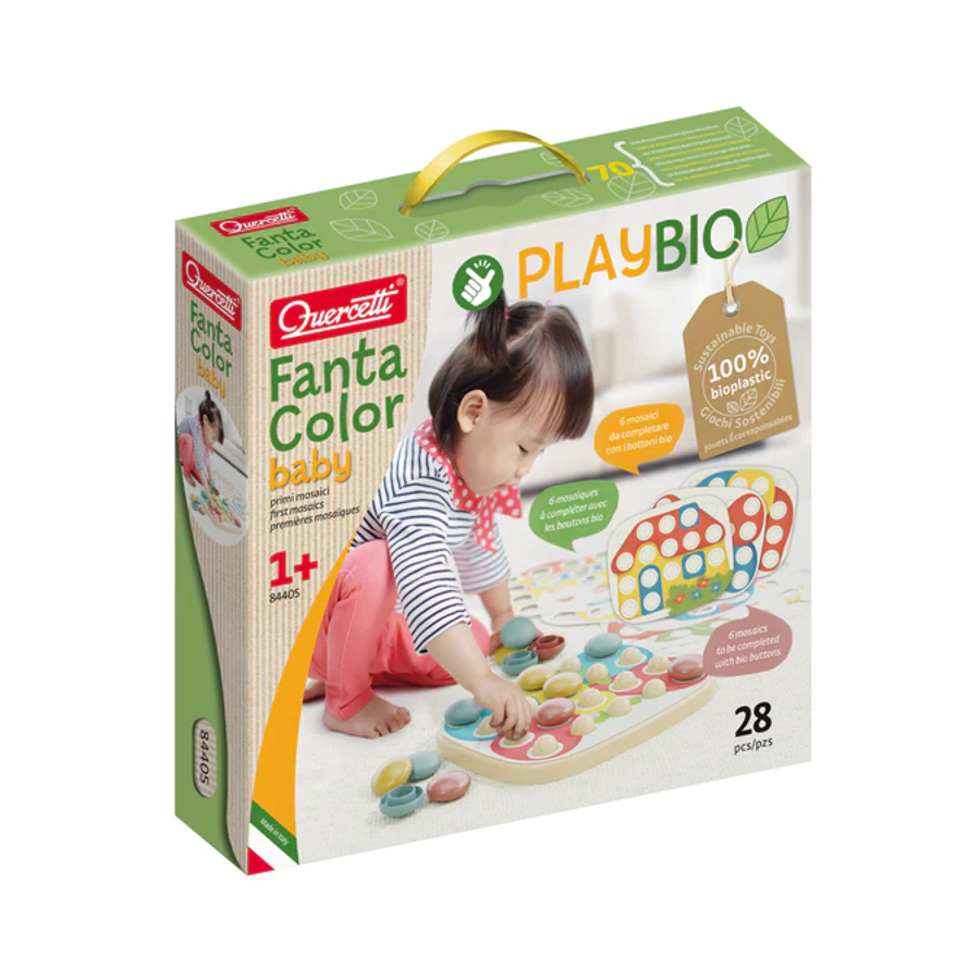 Com este novo jogo bio , bebés e crianças podem brincar com botões coloridos para criarem os seus belos mosaicos. Os botões redondos extra-grandes são fáceis de segurar, pois são especialmente projetados para facilitar o manuseio de crianças mais jovens. Eles estão disponíveis em cores diferentes e podem ser facilmente adaptados a pequenas cúpulas no tabuleiro. O topo das cartas contém uma série de imagens de padrões com ilustrações engraçadas e facilmente reconhecíveis.