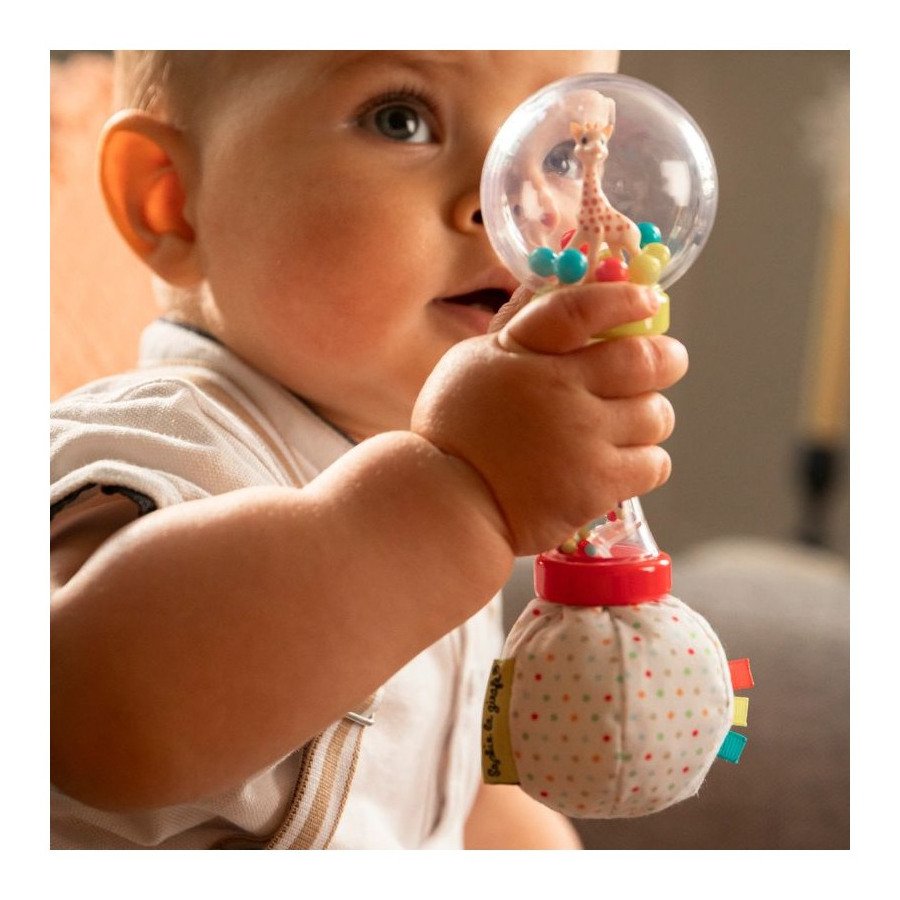 • O Chocalho Maracas: funciona como um bastão de chuva com bolas coloridas que giram em torno da Sophie la girafe. Graças ao formato ergonômico, o chocalho é fácil de agarrar e manusear com as mãozinhas.