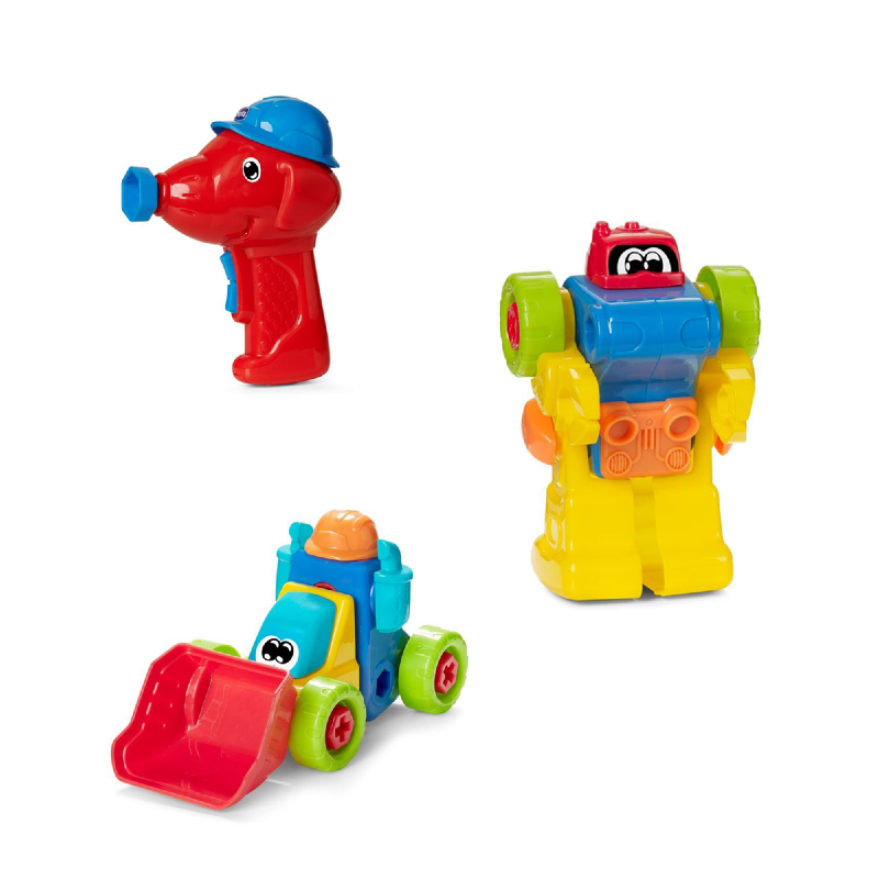 Agora a criança poderá tornar-se mecânico(a) e construir um carro de corrida, um camião, uma escavadora, um comboio, um avião e até um robô. Indicado para crianças entre os 3 e os 6 anos. Contém um berbequim eletrónico para ser mais fácil desmontar o veículo criado, e a sua bateria é substituível.